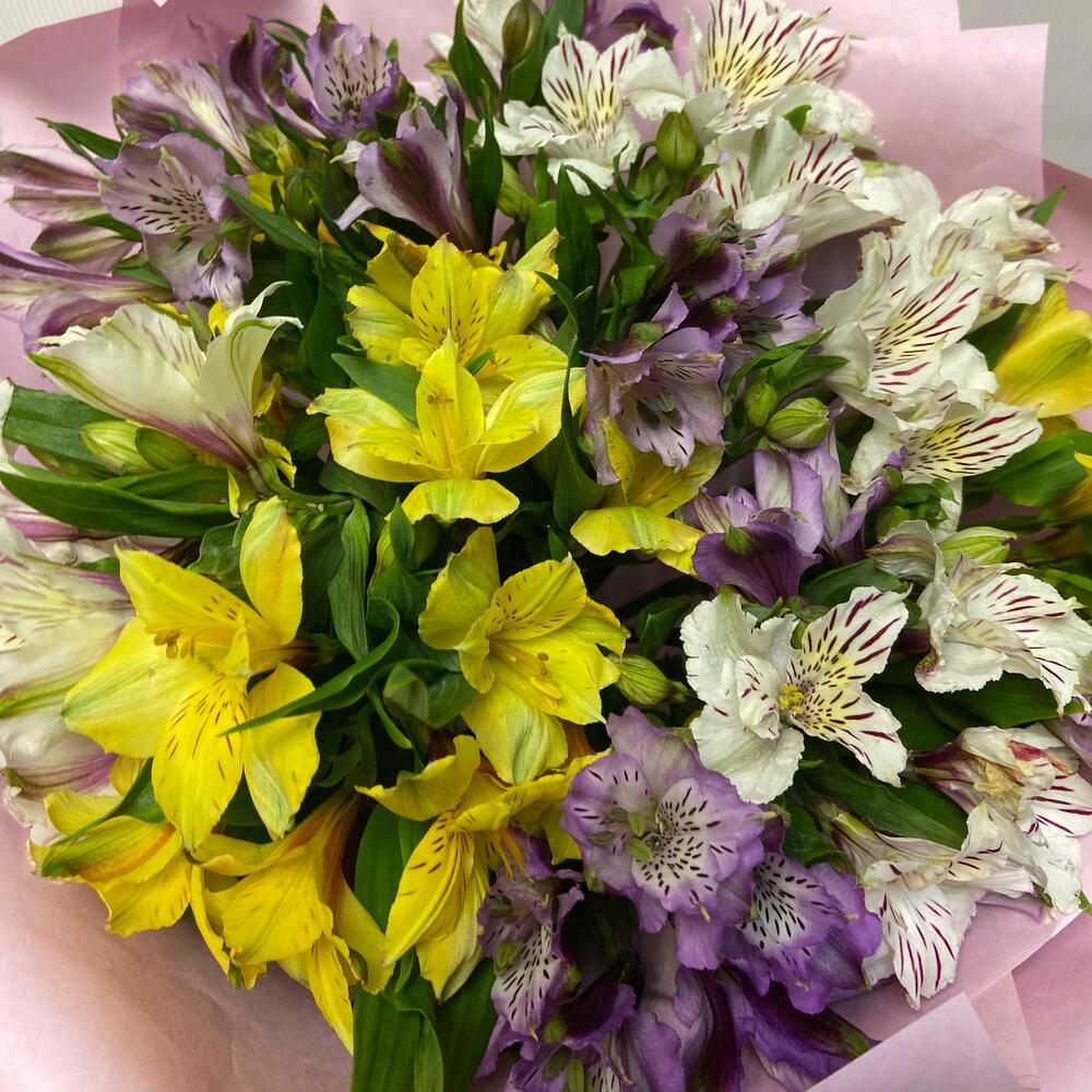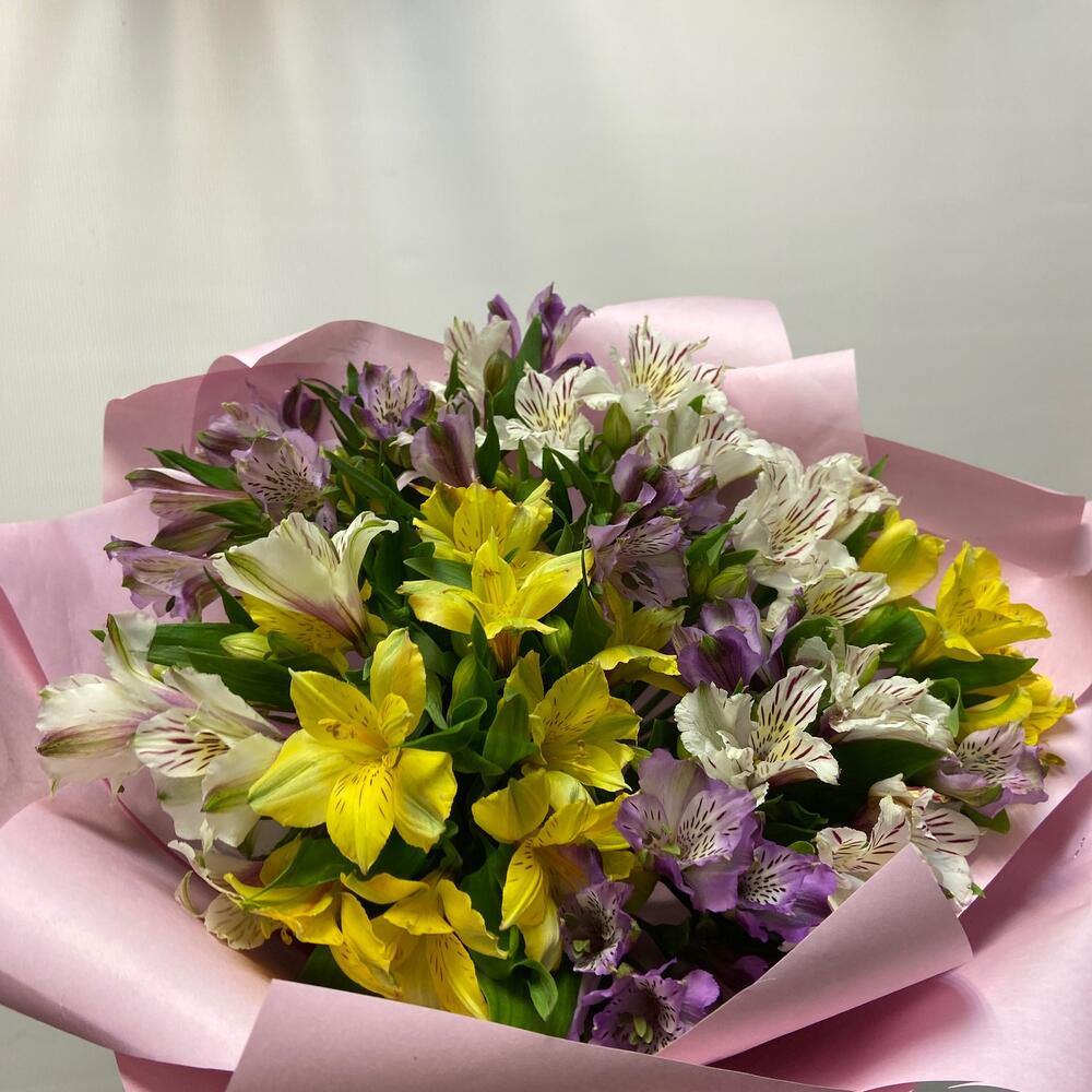 Альстромерия – 13 шт.Упаковка дизайнерская – 1 шт.Лента – 1 шт.