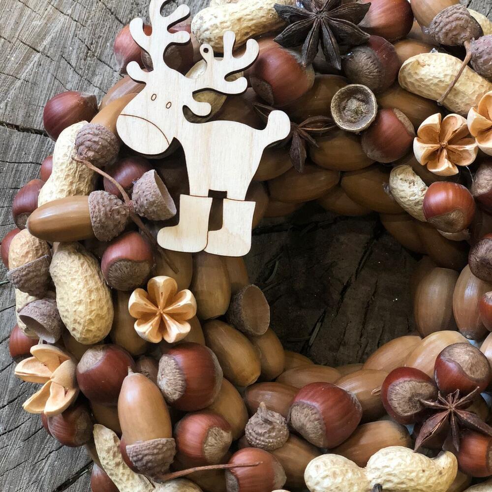 Основа для венка – 1 шт.желуди натуральные – 150 шт.орех фундук (200 гр.) – 1 шт.орех земляной – 45 шт.плоды эвкалипта – 10 шт.Бадьян натуральный – 5 шт.Игрушка деревянная – 1 шт.пленка прозрачная упаковочная – 1 шт.Пакет крафт – 1 шт.