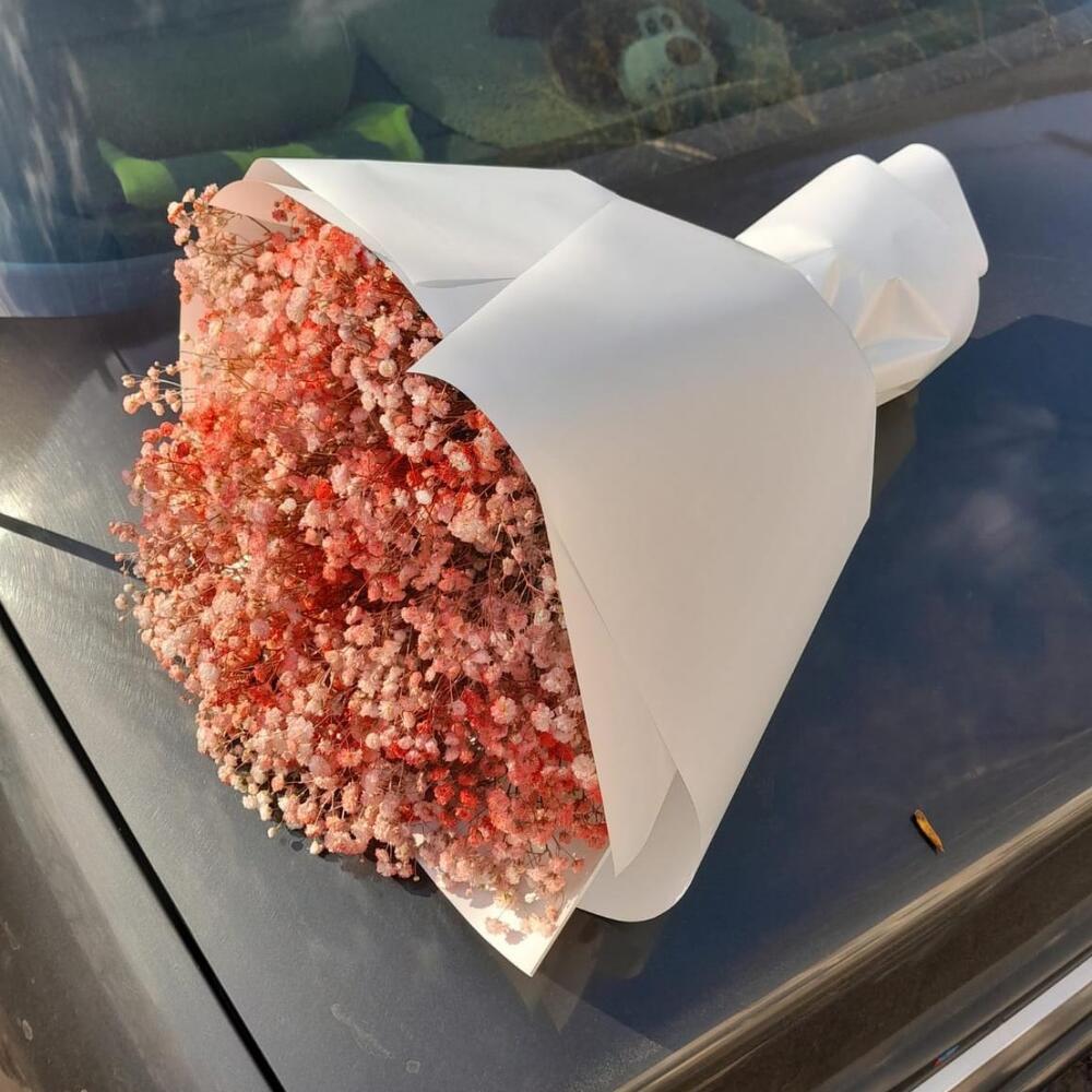 Лента атласная – 3 шт.Упаковка дизайнерская – 3 шт.гипсофила микс – 11 шт.