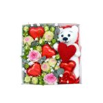 игрушка ручная – 1 шт. пионорозы – 4 шт. Гипсофила – 3 шт. Конфеты – 5 шт. Коробка – 1 шт.