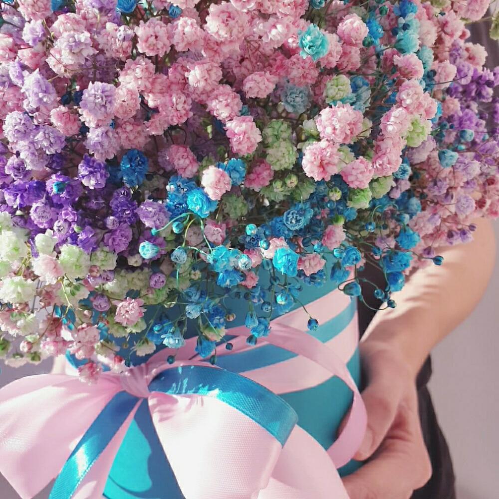 Лента атласная – 2 шт.Оазис флористический – 1 шт.гипсофила радужная – 11 шт.любовь флориста (бесплатно) – 1 шт.коробка шляпная большая изумрудная – 1 шт.
