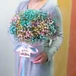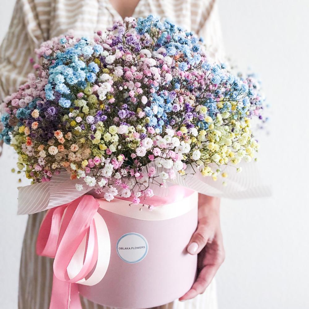 Шляпная коробка – 1 шт.гипсофила цветная – 8 шт.Лента атласная – 2 шт.Тишью – 4 шт.Губка флористическая – 3 шт.Упаковка транспортировочная пленка – 1 шт.