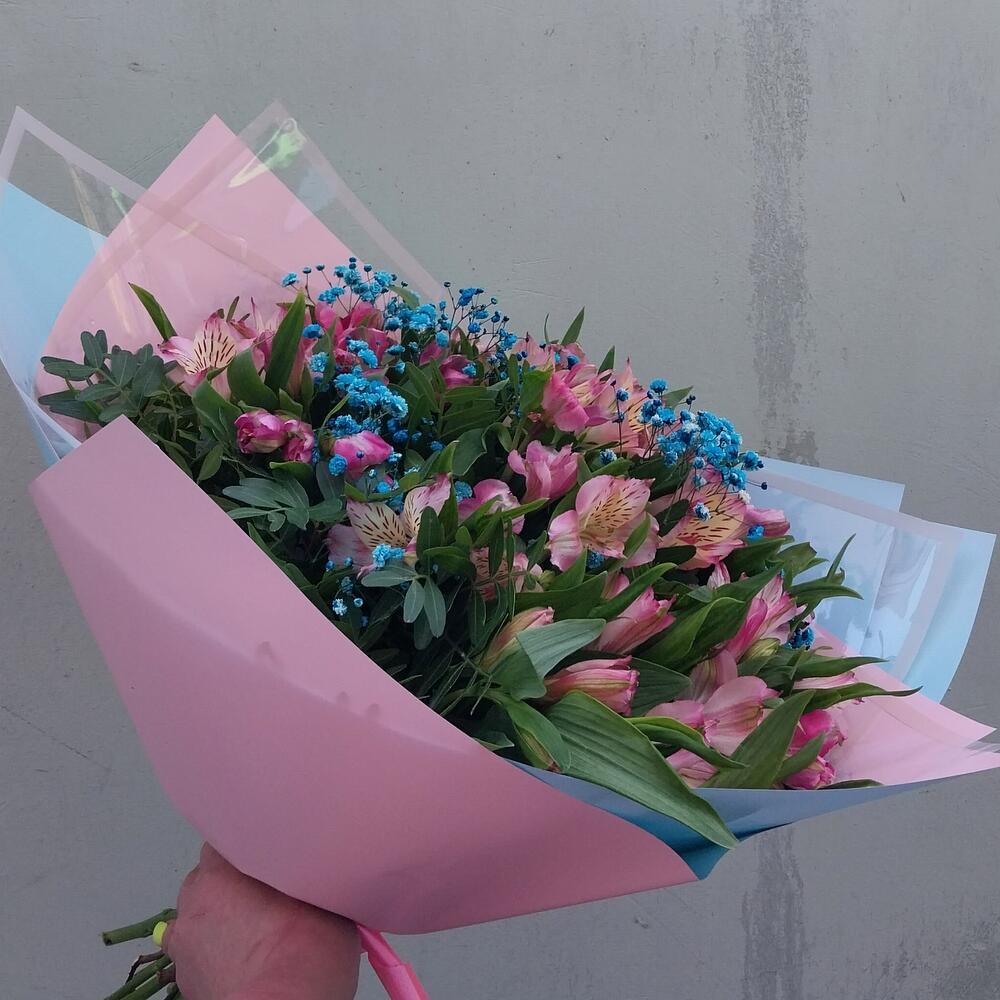 Альстромерия – 15 шт.Лента – 1 шт.Упаковка дизайнерская – 3 шт.фисташка зелень – 10 шт.гипсофила радужная голубая – 3 шт.