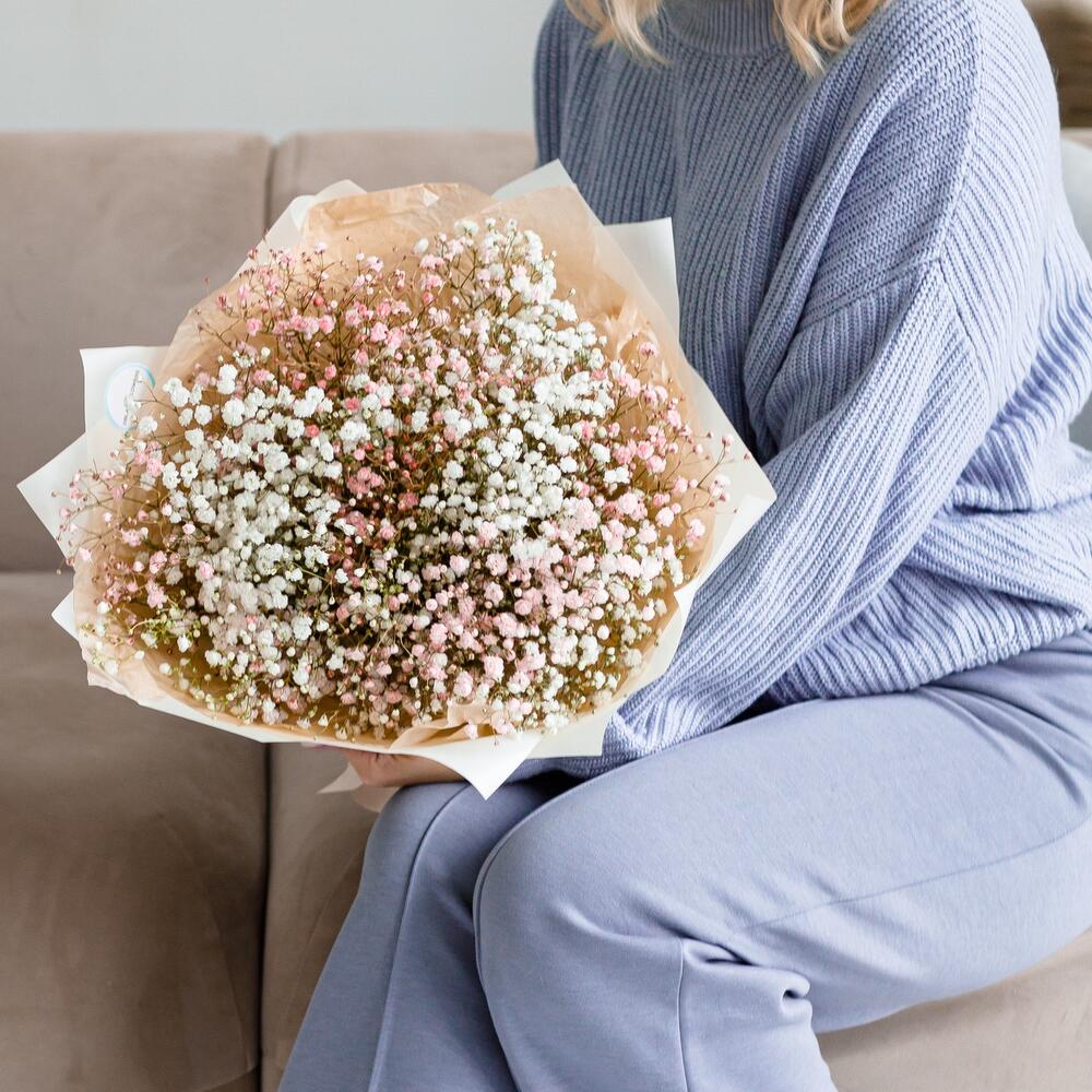 Очаровательный букет из воздушной гипсофилы. Ни одна дама, точно не останется равнодушной при виде такого букета.Инструкция по уходу за цветами прикреплена к каждому заказу.Цветы гипсофилы отличаются стойкостью и даже при высыхании не теряют, декоративности и цвета. Что позволяет, долгое время украшать интерьер в качестве сухоцветов.Подпишем открытку с вашими пожеланиями бесплатно