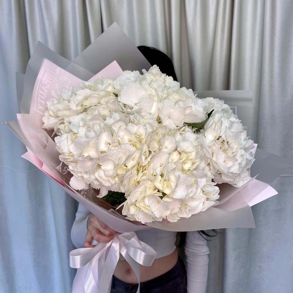 Гортензия – 5 шт.Лента атласная – 3 шт.Аквабокс – 1 шт.Пленка дизайнерская – 5 шт.открытка с вашими пожеланиями – 1 шт.