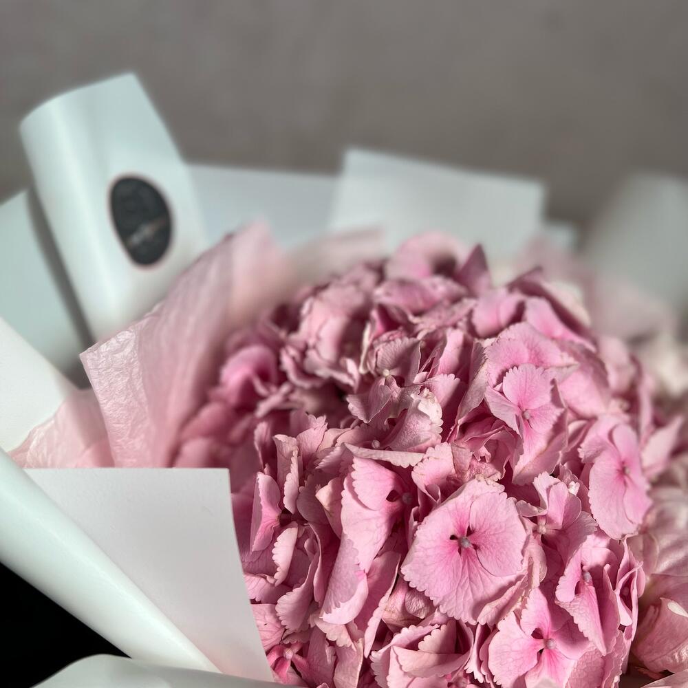 Гортензия – 1 шт.Атласная лента – 1 шт.декоративная упаковка – 1 шт.пионы – 5 шт.