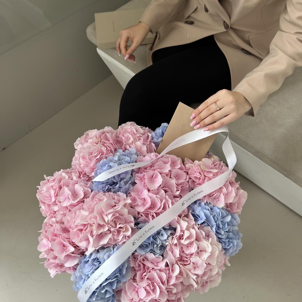 открытка брендированная в подарок – 1 шт.гортензия голландия нежно розовая – 10 шт.гортензия голландия лилово голубая – 5 шт.