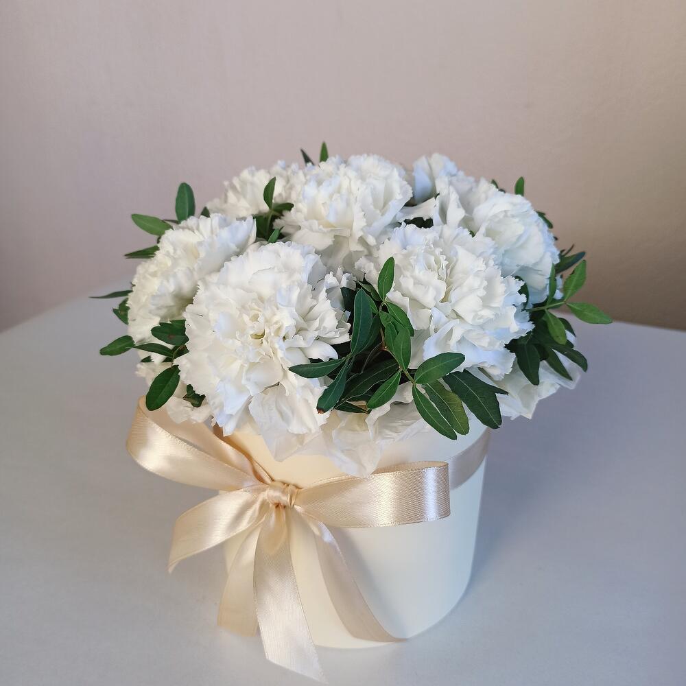 Гвоздика – 7 шт.Лента атласная – 2 шт.Тишью – 1 шт.Коробка шляпная – 1 шт.Оазис флористический – 1 шт.зелень декоративная – 3 шт.