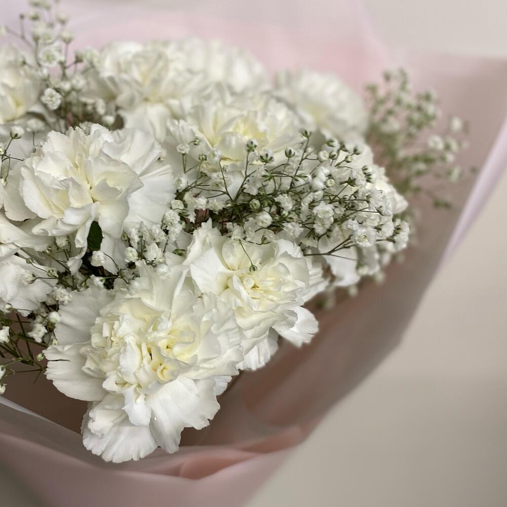 гипсофила белая ветки – 2 шт.Гвоздика сортовая – 11 шт.Упаковка дизайнерская – 6 шт.Лента атласная – 3 шт.