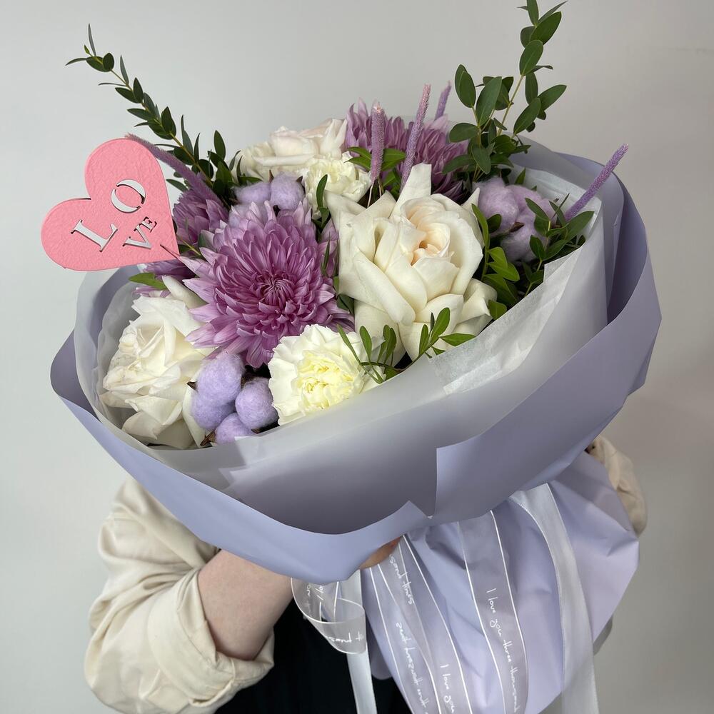 «Лавандовое созвездие» Букет из розы, гвоздики, статица и хлопка