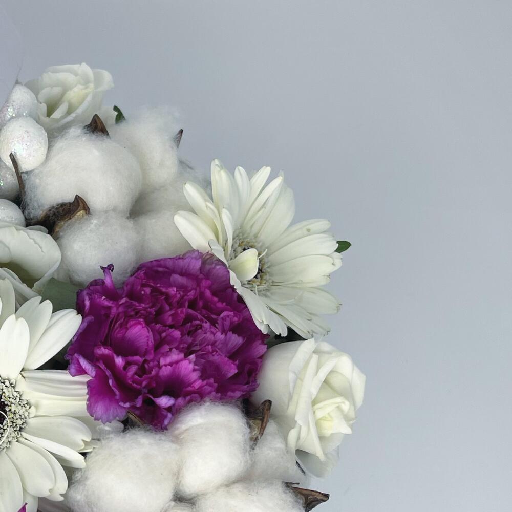 Коробка шляпная – 1 шт.Оазис флористический – 1 шт.Гербера мини белая – 2 шт.гвоздика фиолетовая “мунаква” – 4 шт.Хлопок натуральный – 3 шт.эустома белая – 1 шт.Ягоды декор – 1 шт.Эвкалипт – 1 шт.