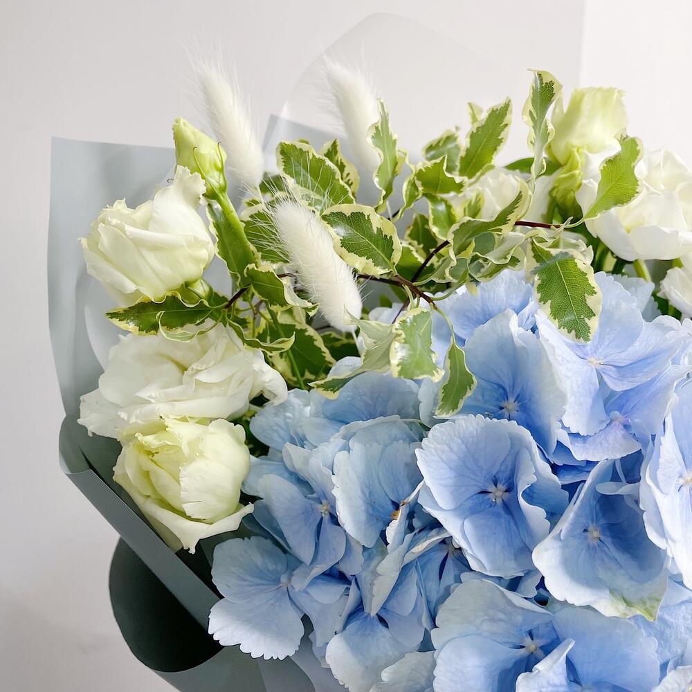 Гортензия – 1 шт.Оксипеталум – 1 шт.Альстромерия – 1 шт.Лизиантус – 1 шт.Диантус – 2 шт.Питтоспорум – 1 шт.Лагурус – 3 шт.Упаковка дизайнерская – 1 шт.