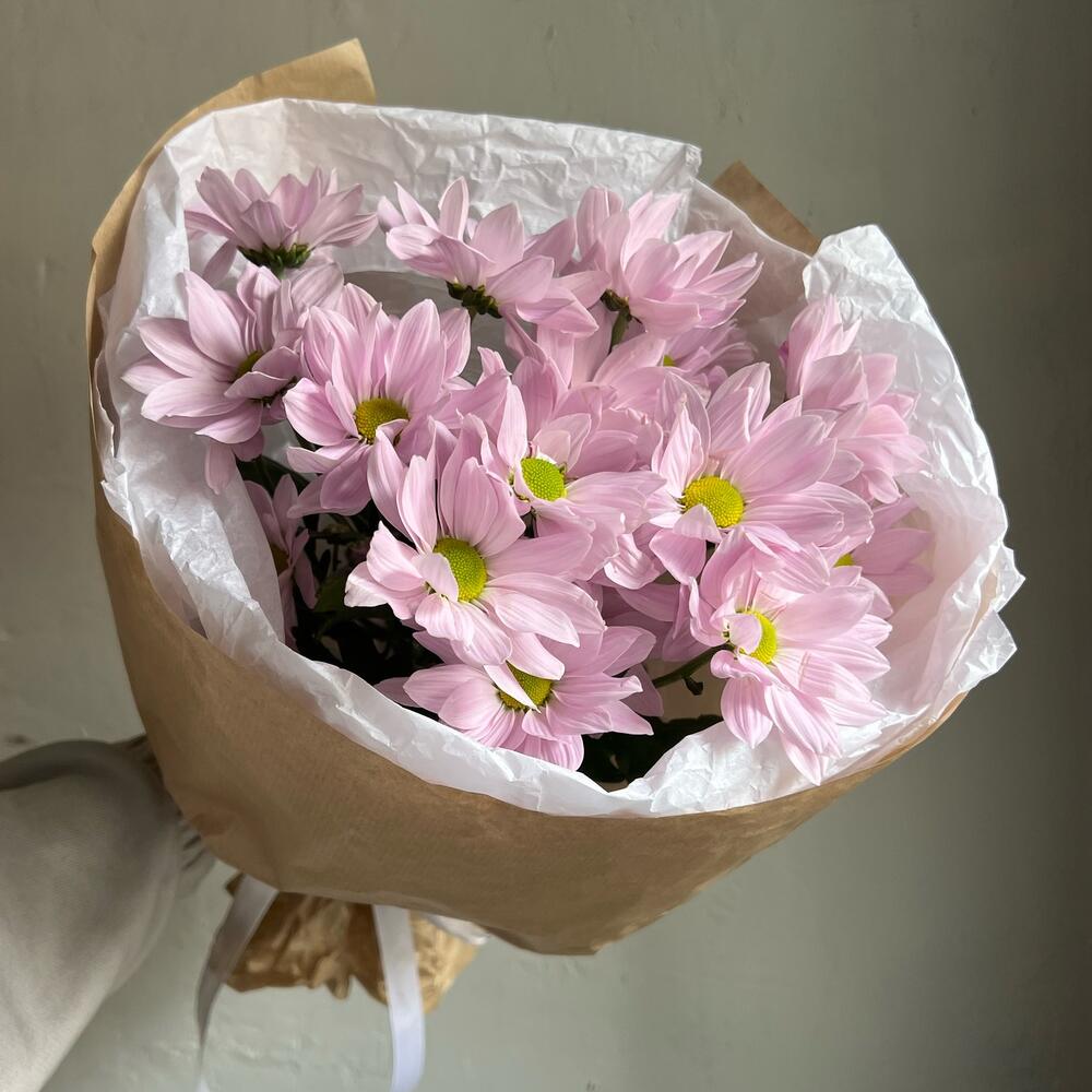 Хризантема кустовая – 3 шт.Лента атласная – 2 шт.Упаковка дизайнерская – 2 шт.