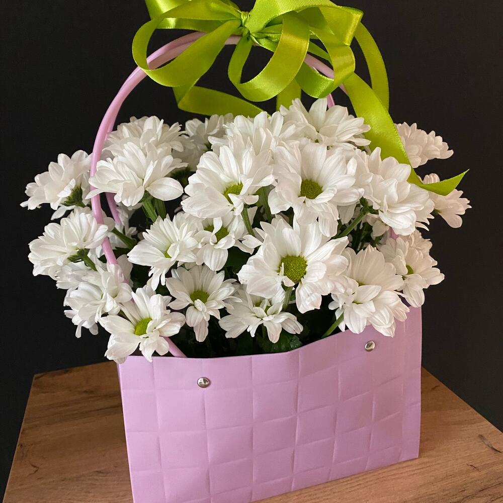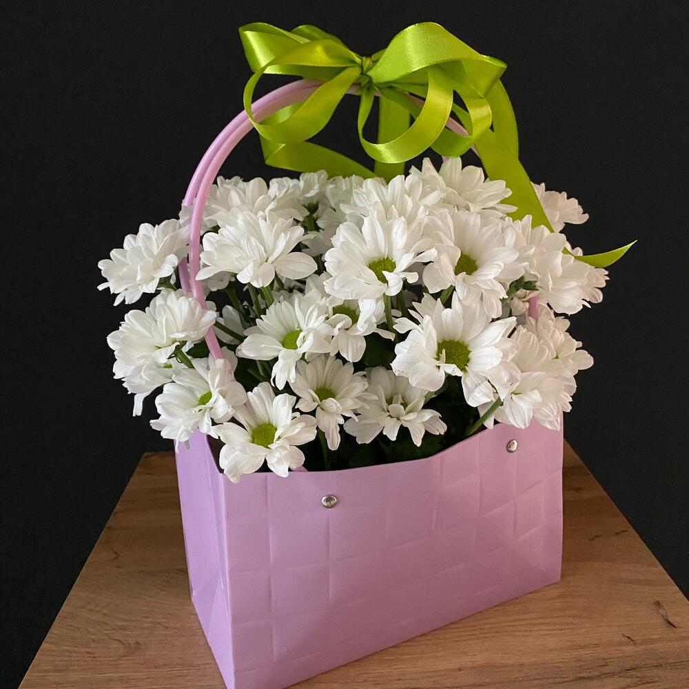Сумочка с шикарной белой хризантемой прекрасно подойдет для презента или поздравления. Создай настроение с Provence Flowers