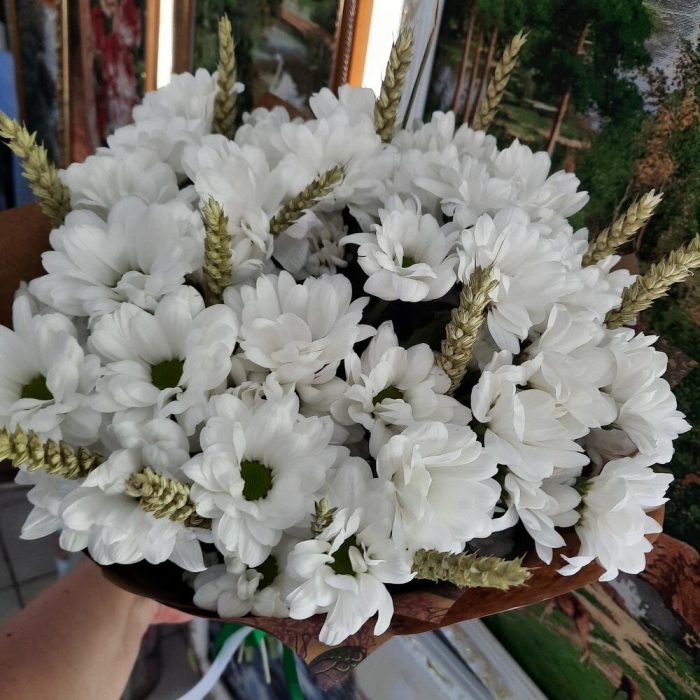 Хризантема кустовая – 7 шт.Колоски пшеницы – 16 шт.Упаковка дизайнерская – 1 шт.