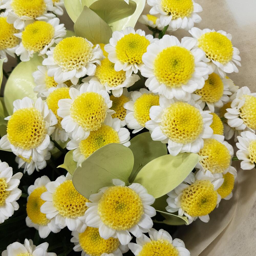 Хризантема кустовая – 7 шт.Рускус – 3 шт.Упаковка дизайнерская – 1 шт.