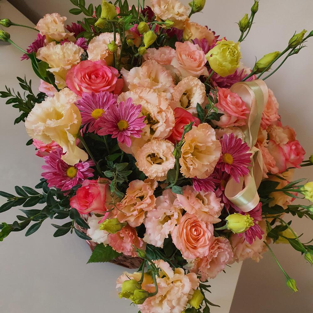 Альстромерии, Гвоздики, Кустовые розы, Лизиантусы, Розы, Хризантемы