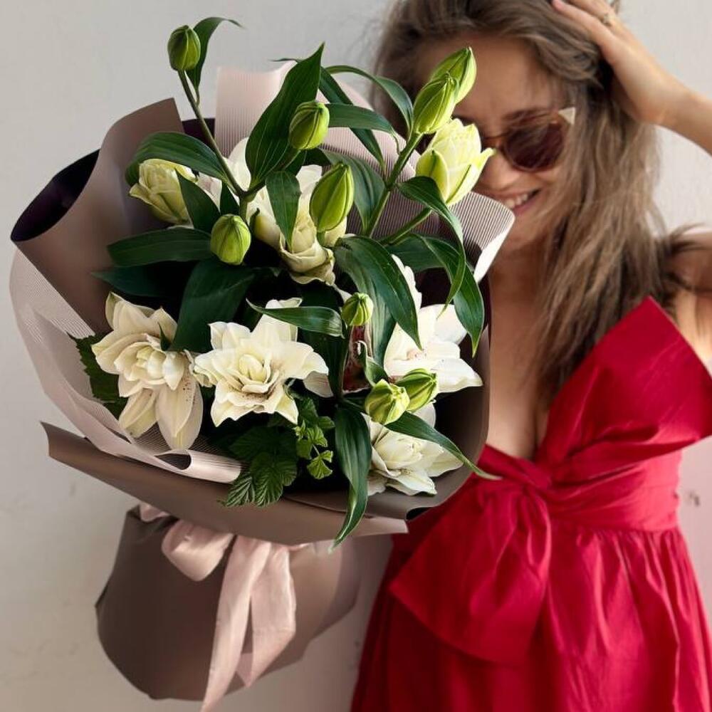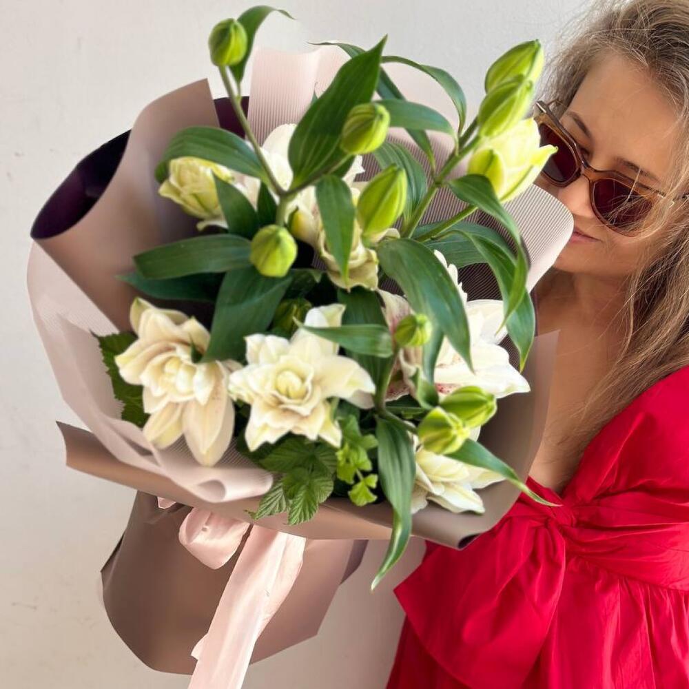 Авторский букет “Окно в сад”: пионовидная лилия, кружевная гвоздика и стойкая альстромерия