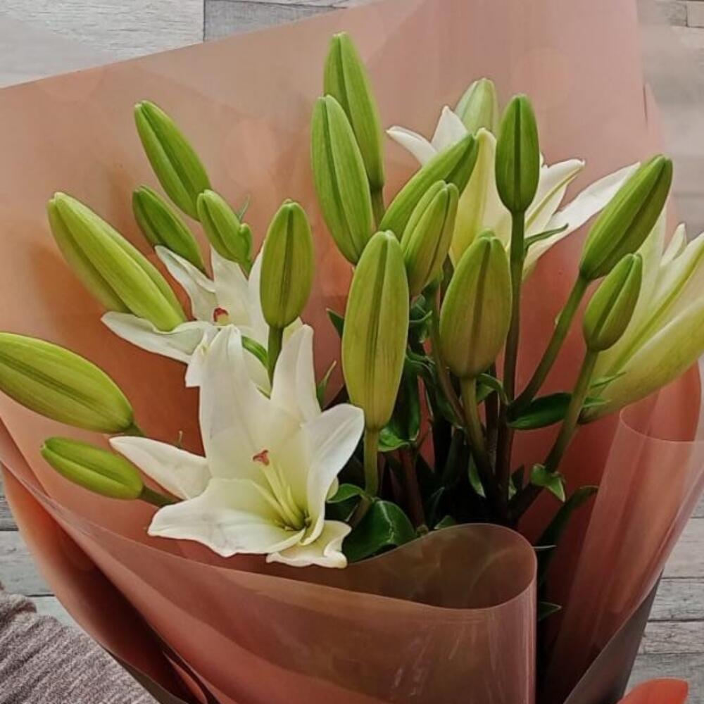 Лента атласная – 2 шт.Упаковка дизайнерская – 2 шт.Лилия Азиатская белая – 5 шт.