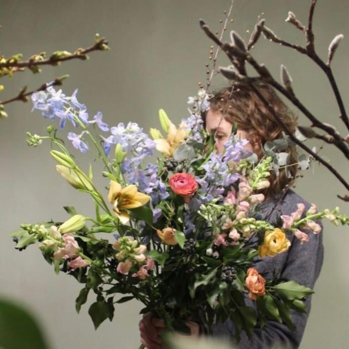 Лилия – 3 шт.Ранункулюс (лютик) – 5 шт.Львиный зев – 5 шт.Дельфиниум – 5 шт.Хедера – 3 шт.лен ветки – 2 шт.Эвкалипт – 7 шт.Лента – 1 шт.