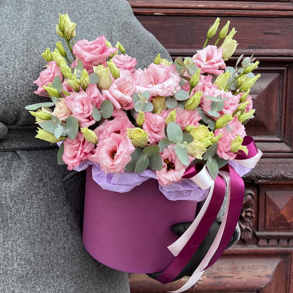 Эвкалипт – 3 шт.Лента атласная – 2 шт.Тишью – 1 шт.Коробка шляпная – 1 шт.Оазис флористический – 1 шт.эустома махровая розовая – 7 шт.