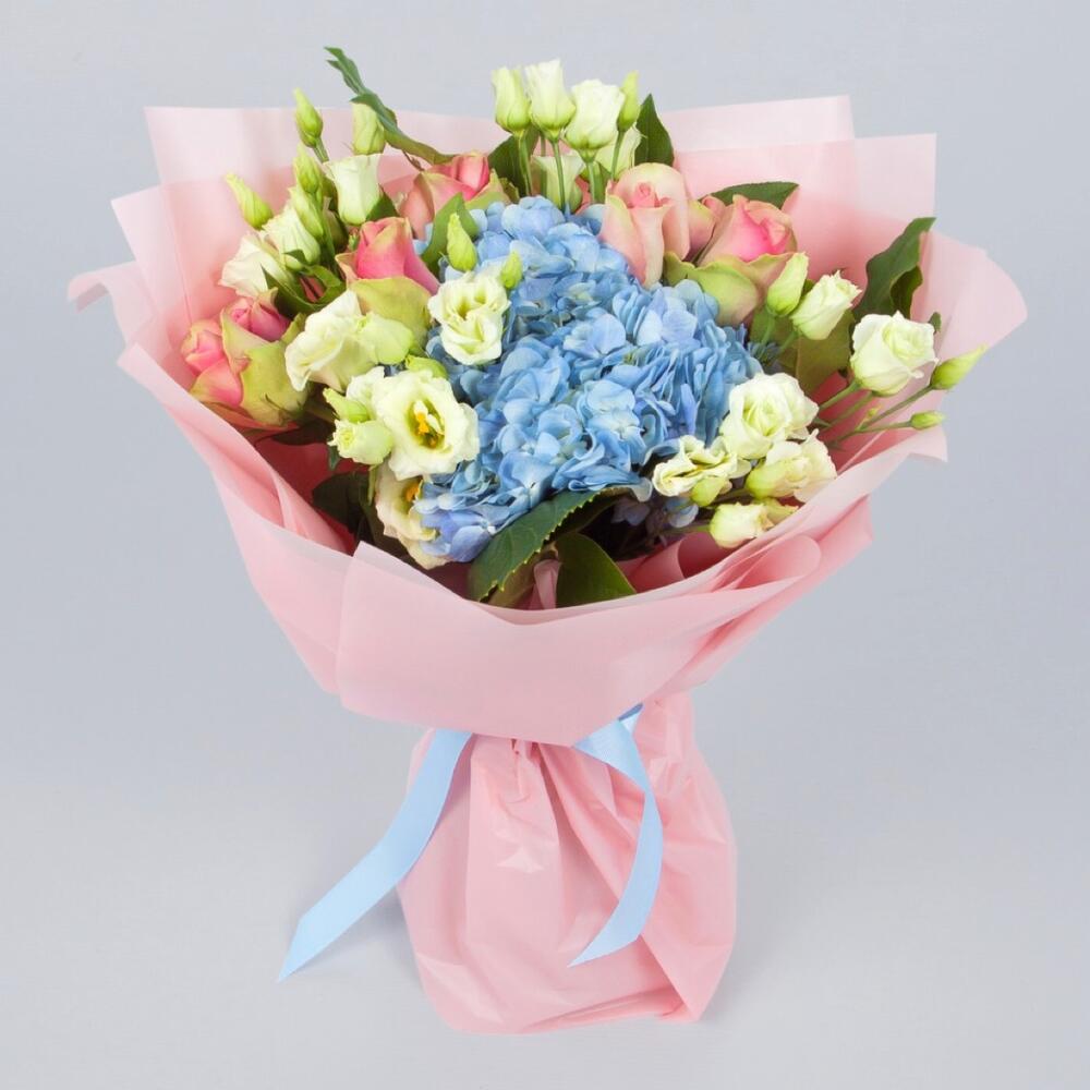 Гортензия – 1 шт. Эустома – 5 шт. троянда – 7 шт. Оформление – 1 шт.