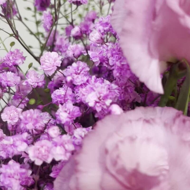 Букет с диантусами , лизиантусами и статицец