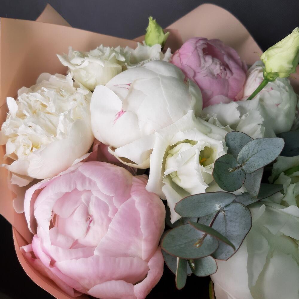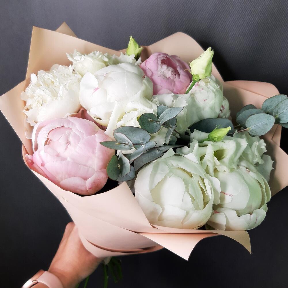 Лизиантус – 2 шт.Пион – 7 шт.Эвкалипт – 1 шт.Упаковка дизайнерская – 3 шт.