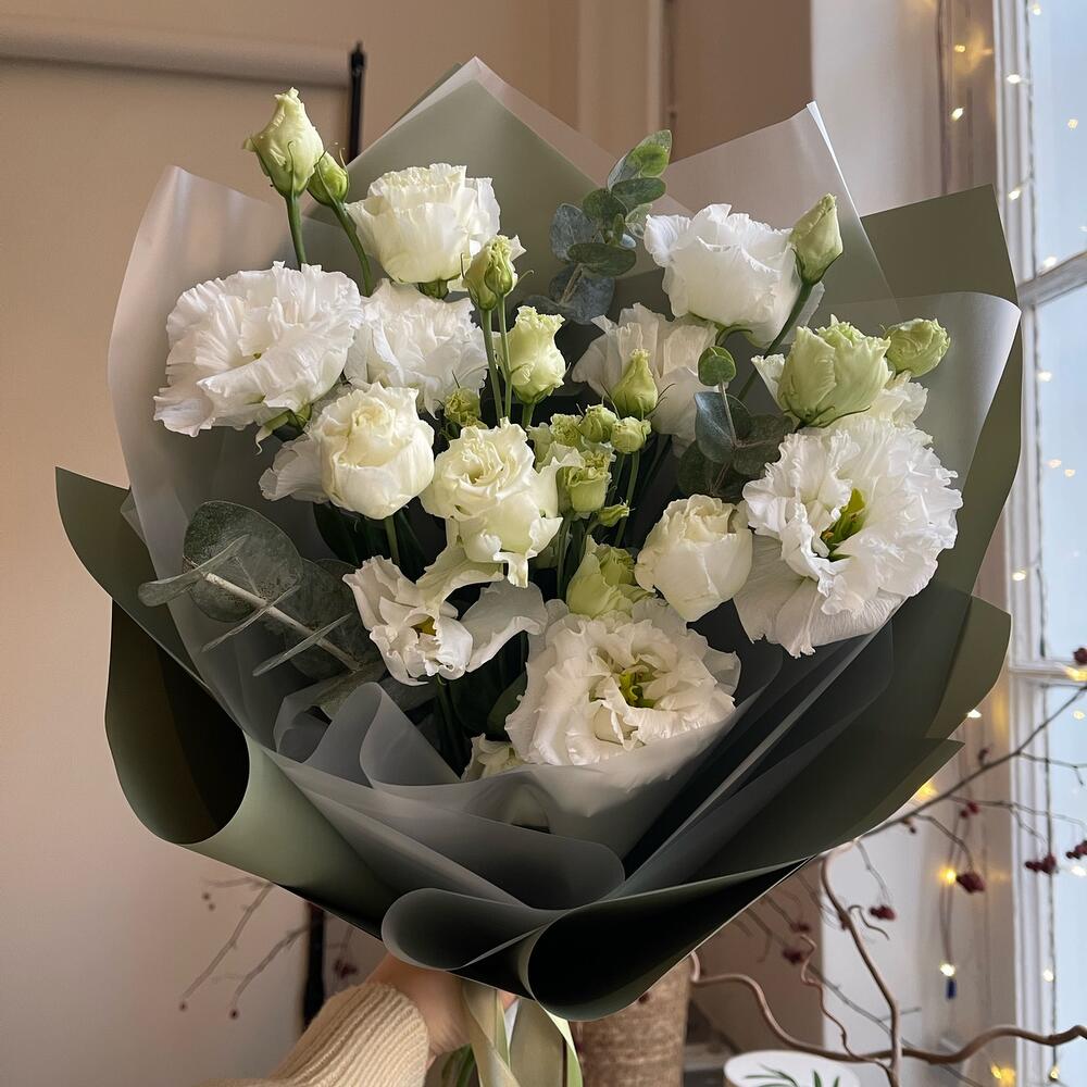 Лизиантус – 3 шт.Эвкалипт – 2 шт.Упаковка дизайнерская – 2 шт.Лента атласная – 2 шт.