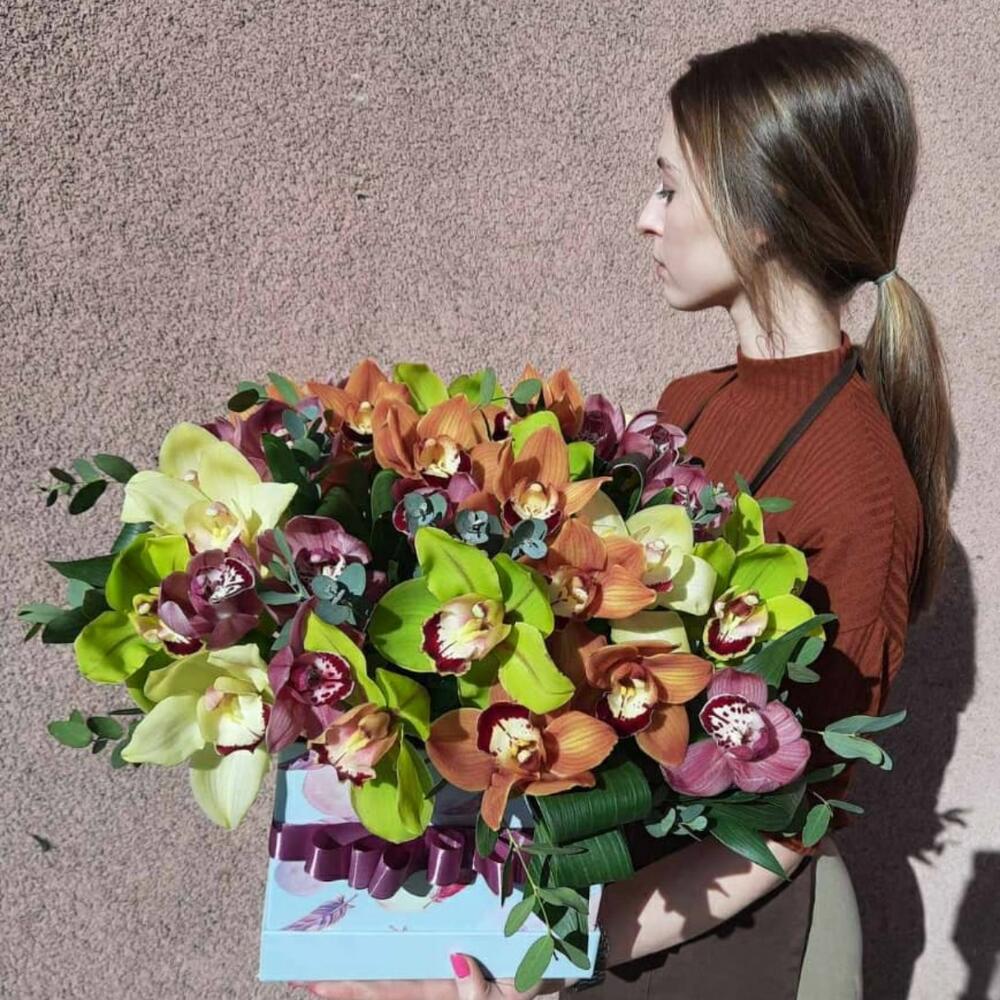 Орхидея Цимбидиум – 41 шт.Оазис флористический – 1 шт.Эвкалипт – 10 шт.Коробка квадратная – 1 шт.