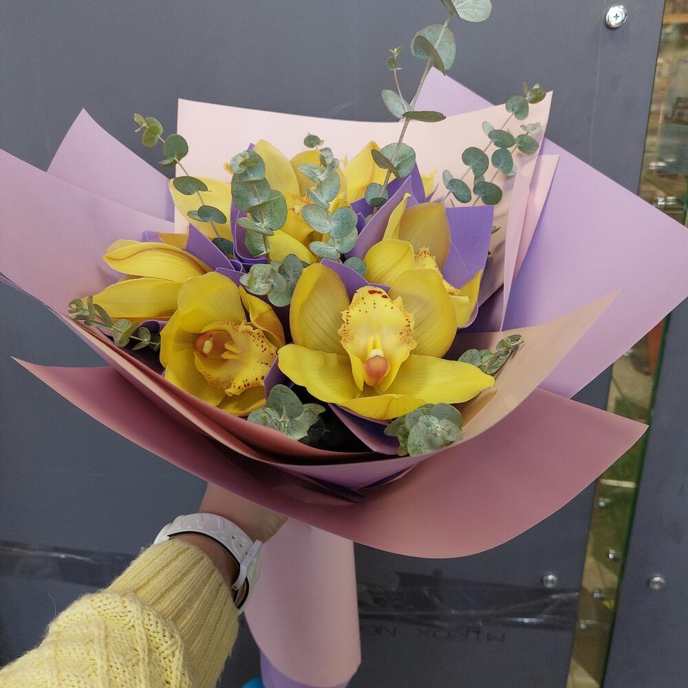 Орхидея Цимбидиум – 7 шт.Эвкалипт – 5 шт.Упаковка дизайнерская – 3 шт.Лента атласная – 2 шт.