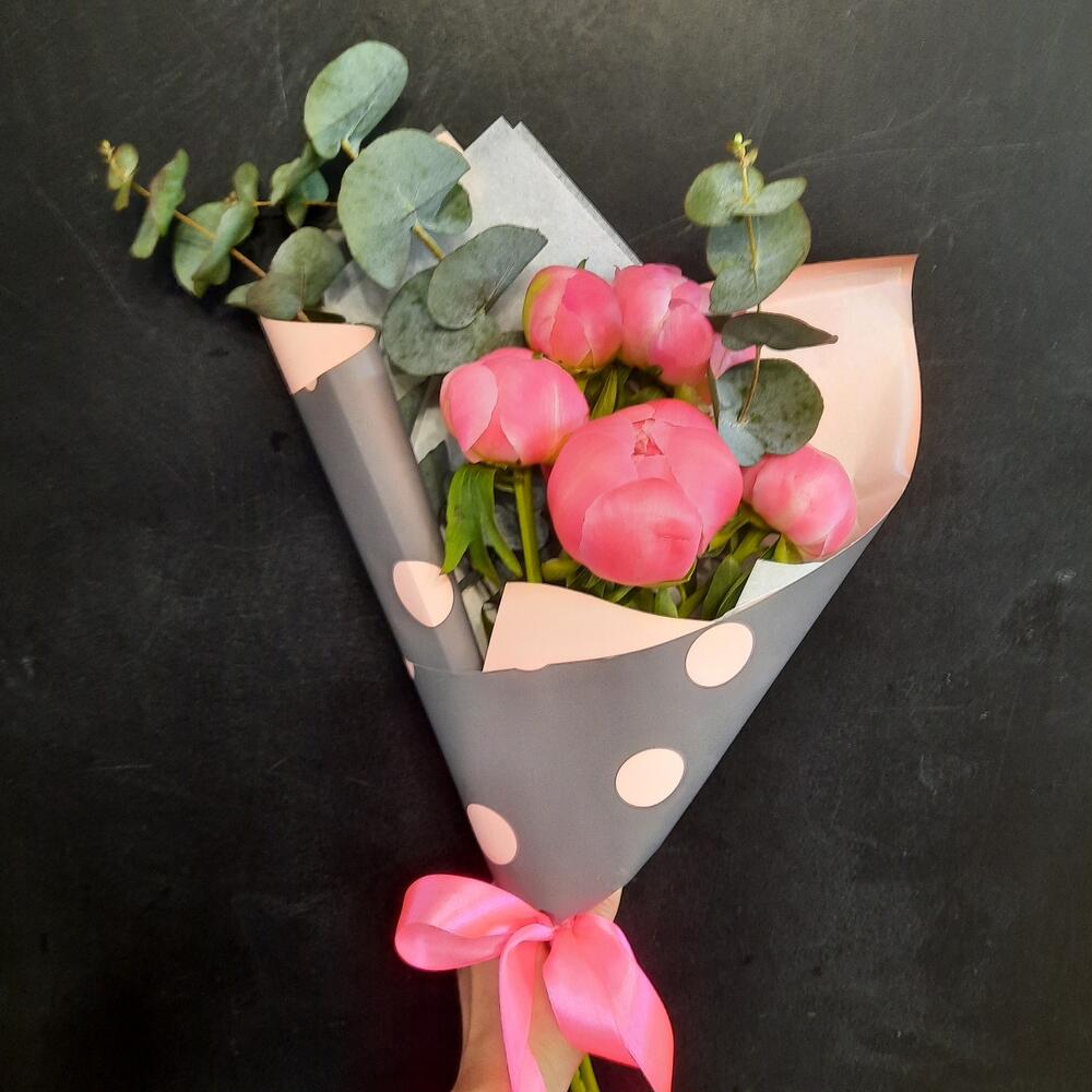 Пион Коралл Шарм (Coral Charm) – 5 шт.Эвкалипт – 1 шт.Упаковка дизайнерская – 1 шт.