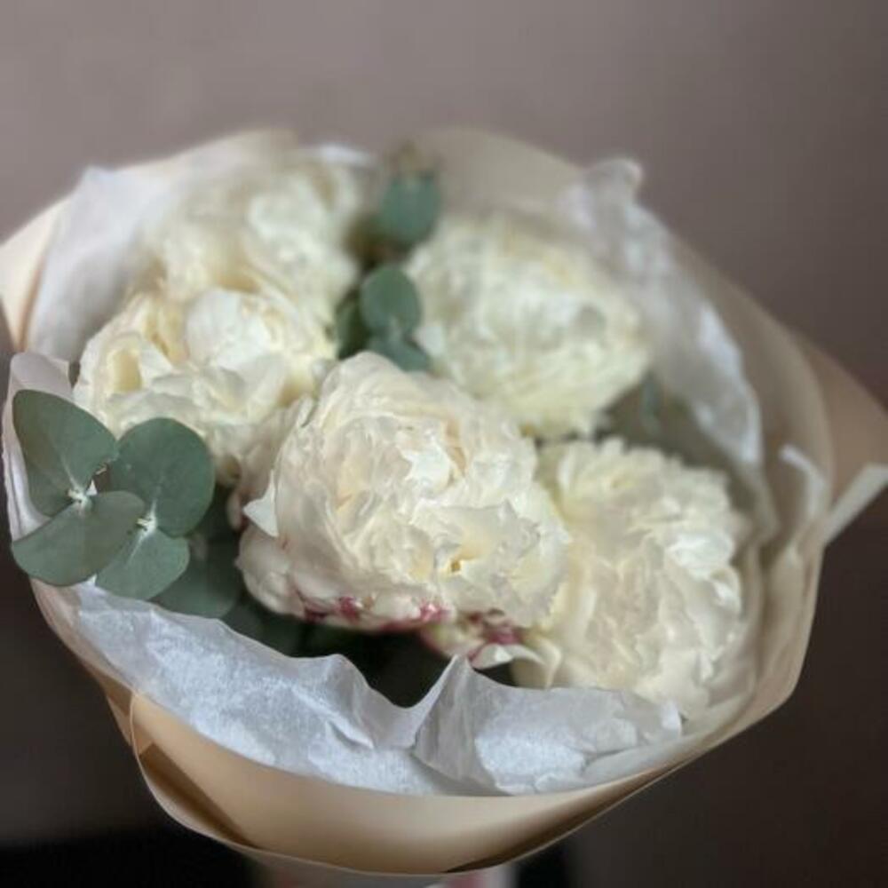Букет из 5 белых пионов и эвкалипта