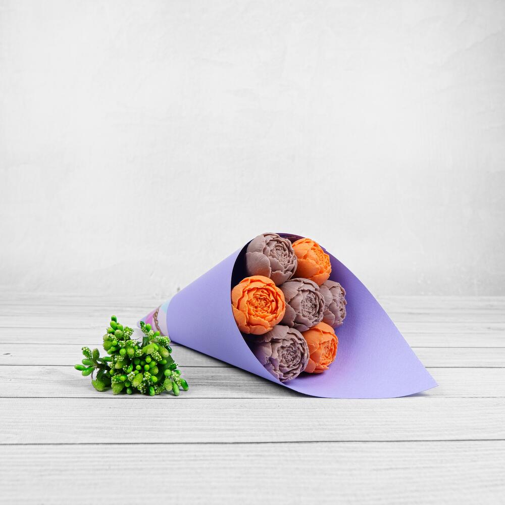 Букет из 7 шоколадных пионов оранжево-сиреневых в дизайнерском картоне