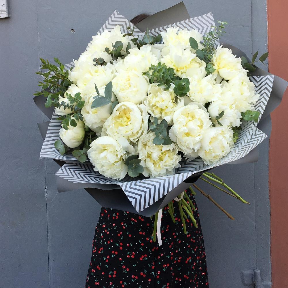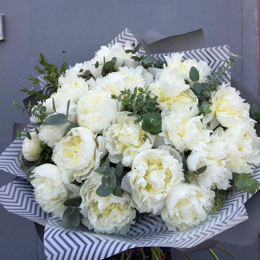 Роскошный букет из 19 белых пионов, с веточками ароматного эвкалипта, в лаконичной упаковке.Стильное цветочное решение длялюбого случая.Ширина букета около 70 сантиметров, высота букета около 70 сантиметров.