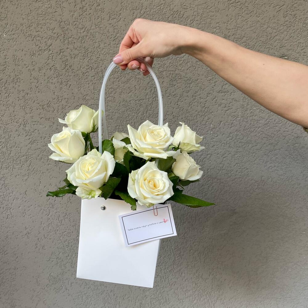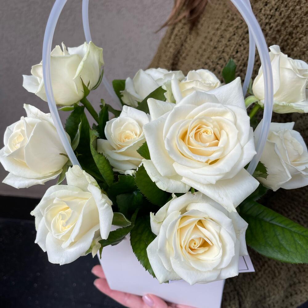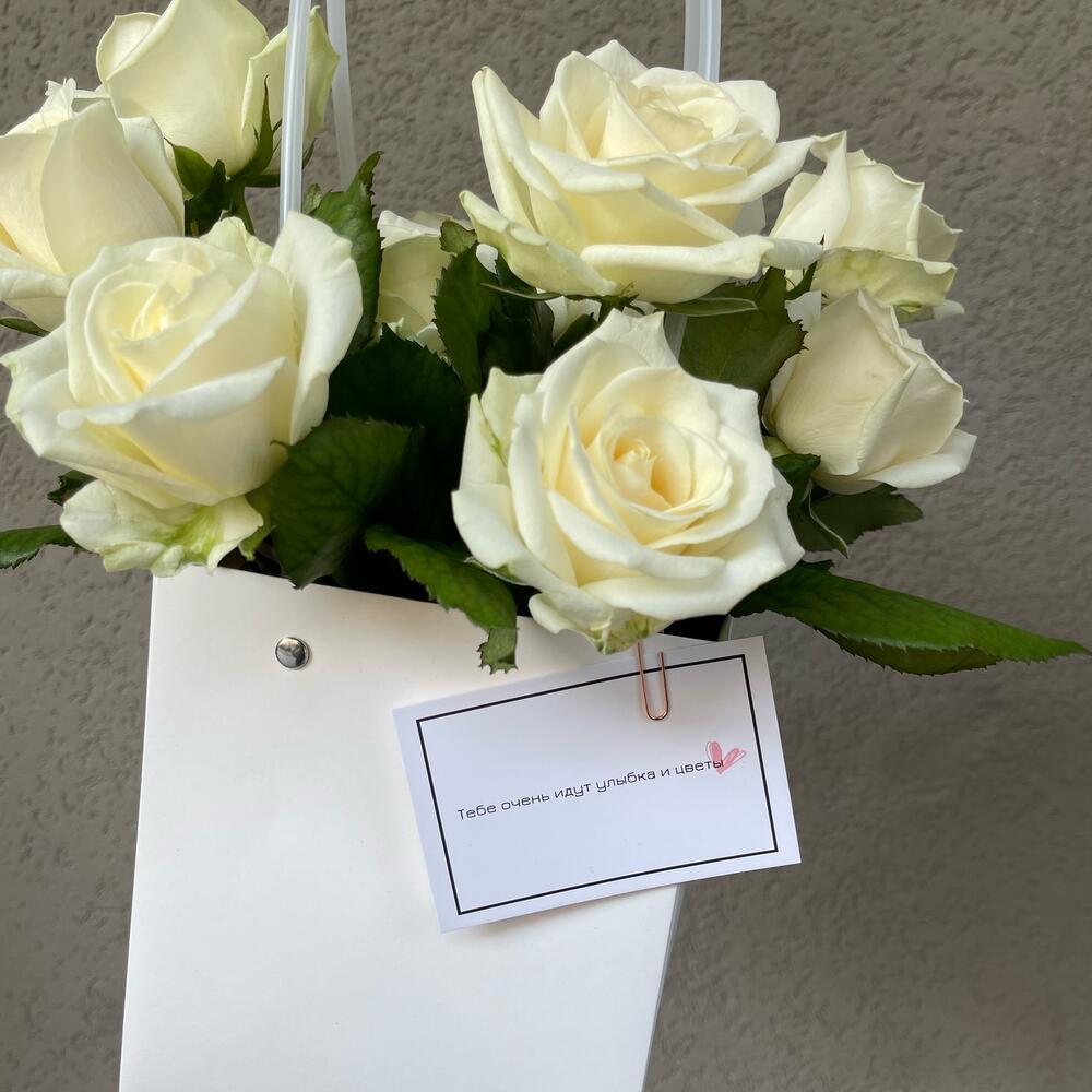 Роза белая – 13 шт.Оазис флористический – 1 шт.Пакет для цветов – 1 шт.