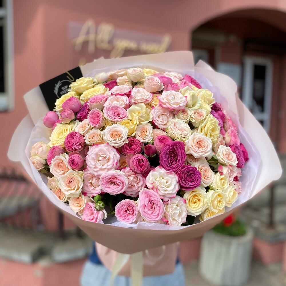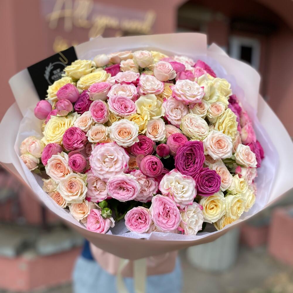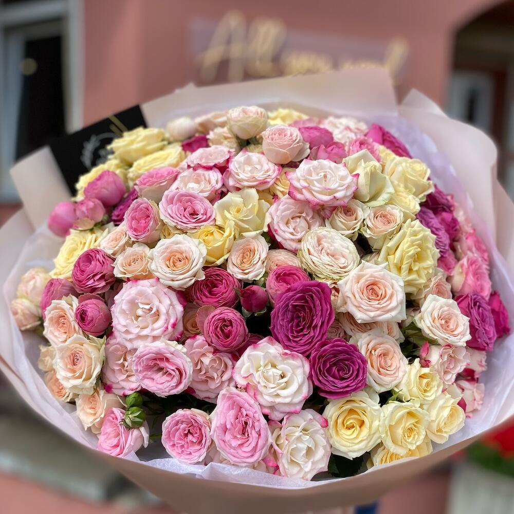 Альстромерии, Гвоздики, Кустовые розы, Лизиантусы, Розы, Хризантемы