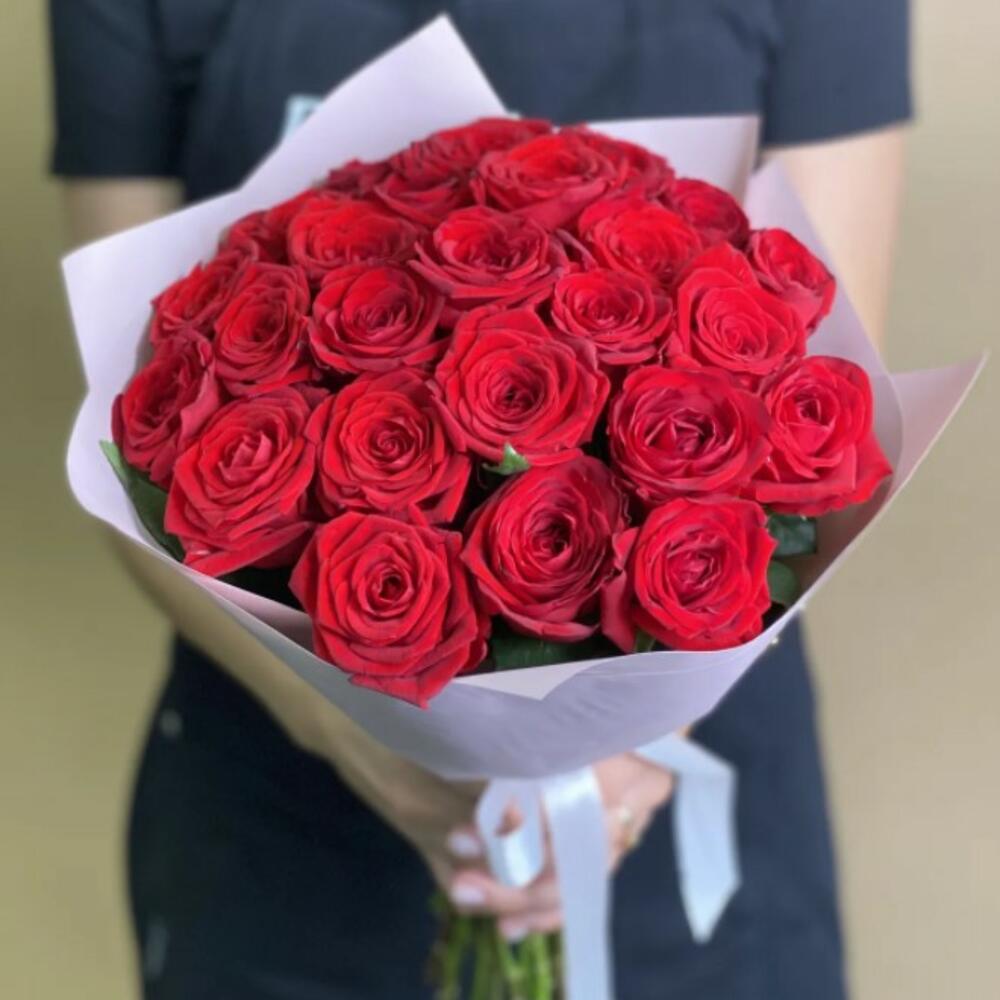 Атласная лента – 1 шт.Роза красная 50 см – 25 шт.сиреневая упаковка – 1 шт.