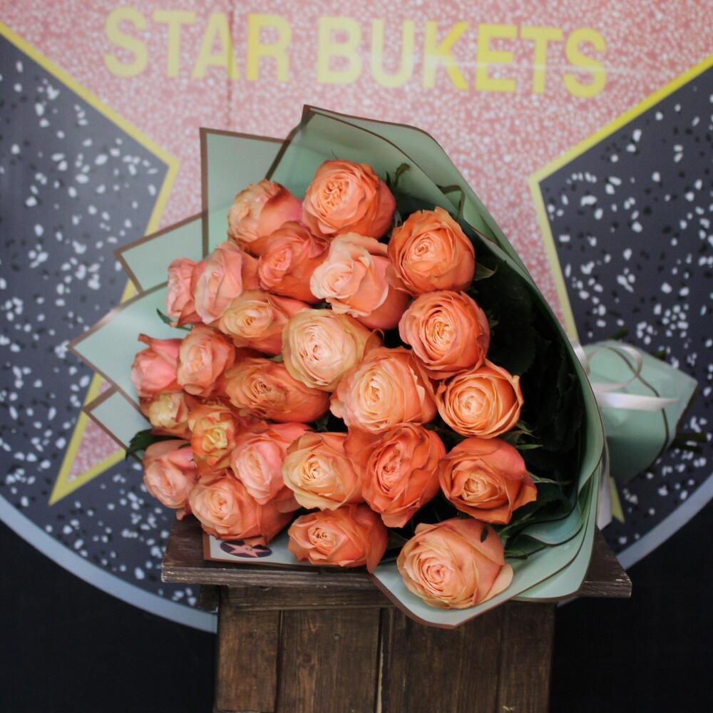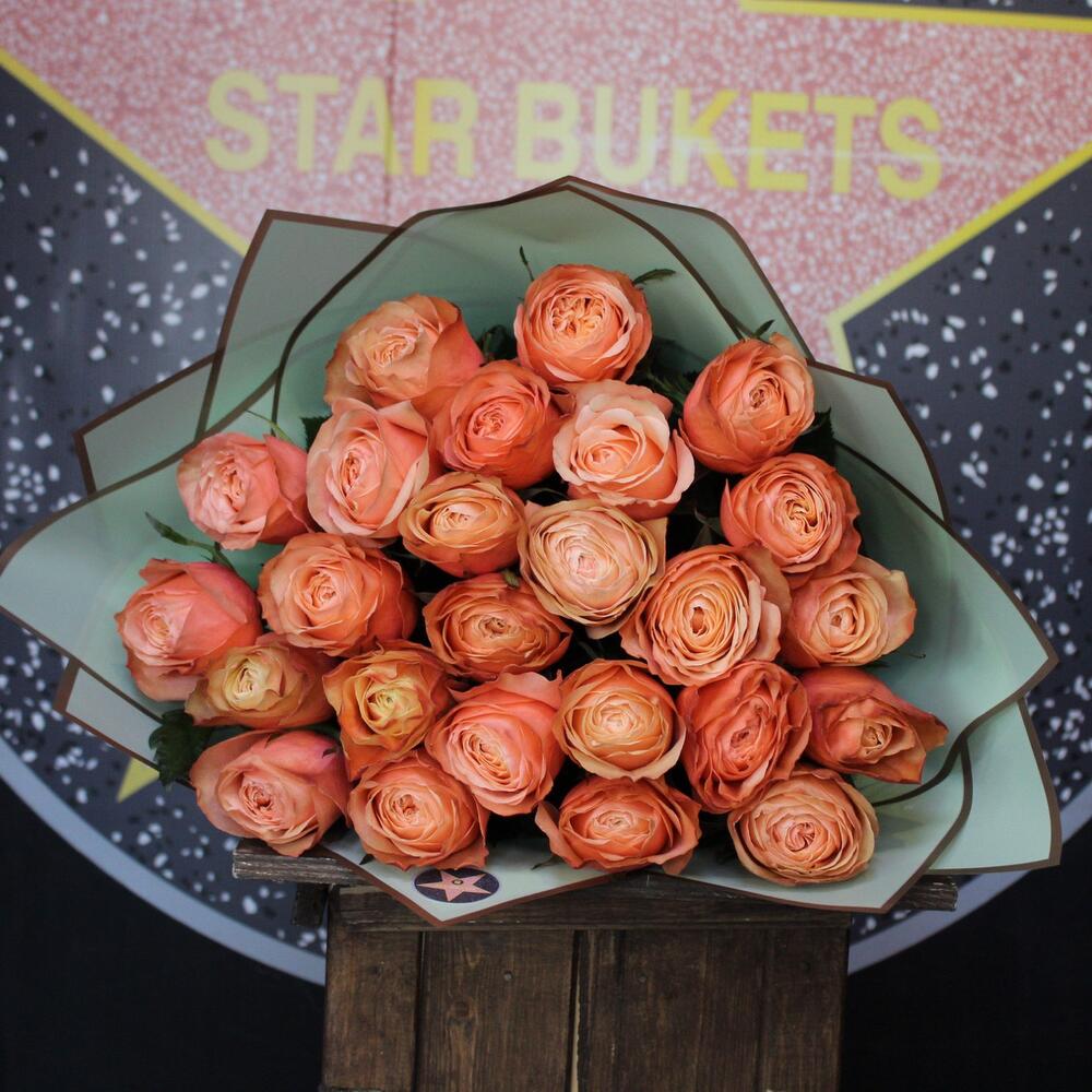 Роза пионовидная кахала – 25 шт.Пленка дизайнерская – 2 шт.Лента атласная – 1 шт.