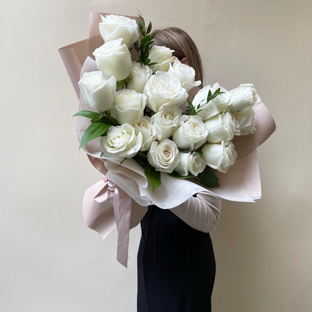 Роза белая – 19 шт.Рускус Италия – 2 шт.Упаковка дизайнерская – 1 шт.