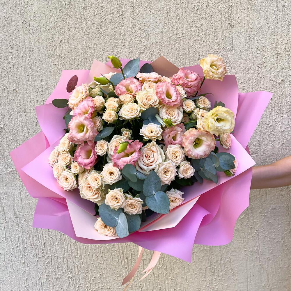 Роза кустовая – 10 шт. Эвкалипт – 5 шт. Роза – 7 шт. Упаковка – 1 шт. Эустома – 5 шт. Лента атласная – 1 шт.