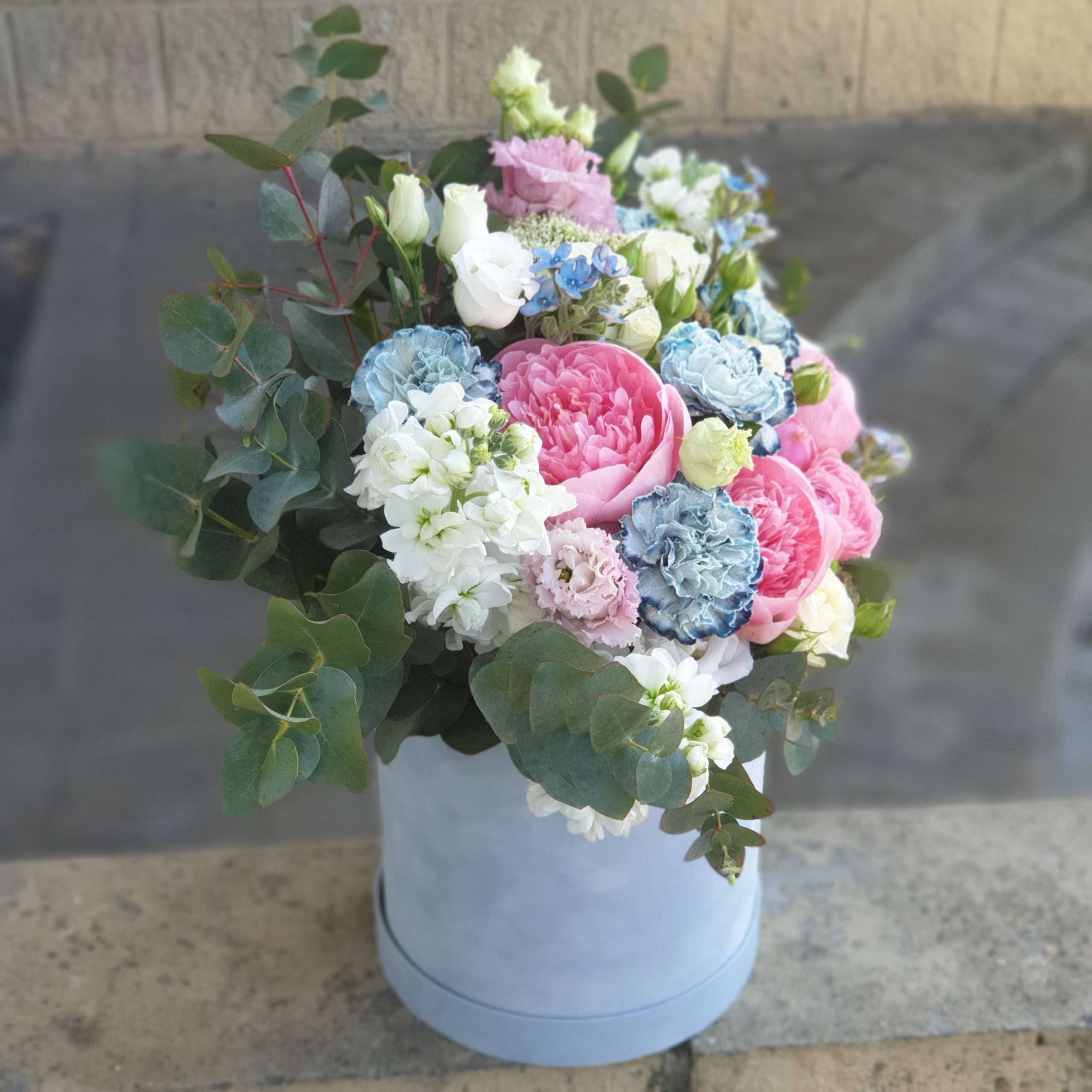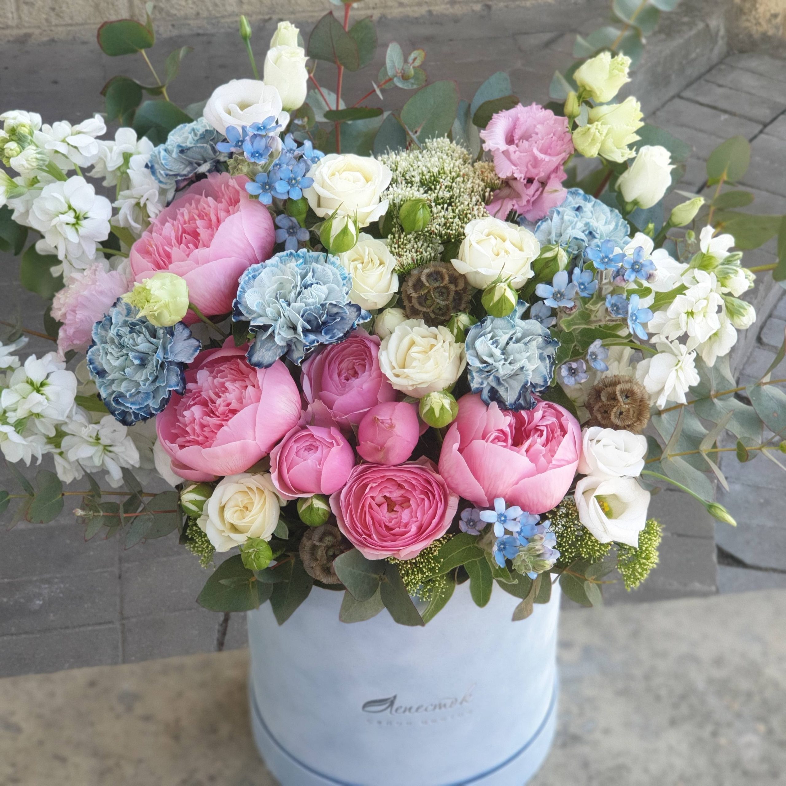 Бархатный цилиндр из голубых диантусов, розовых пионов и ароматной маттиолы