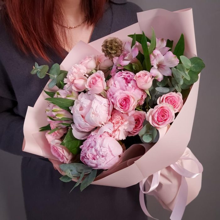 Альстромерия – 2 шт.Эвкалипт – 2 шт.Пион Сара Бернар – 3 шт.Упаковка дизайнерская – 1 шт.Аквапак – 1 шт.Диантус розовый – 2 шт.Средство для продления жизни цветов – 2 шт.Скабиоза стелата – 1 шт.роза кустовая динара – 3 шт.
