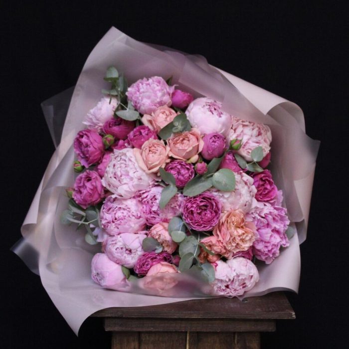 Эвкалипт – 3 шт.Лента атласная – 1 шт.Пион Сара Бернар – 11 шт.Пленка дизайнерская – 3 шт.Роза кустовая пионовидная джульетта – 3 шт.роза кустовая пионовидная misty bubbles – 5 шт.