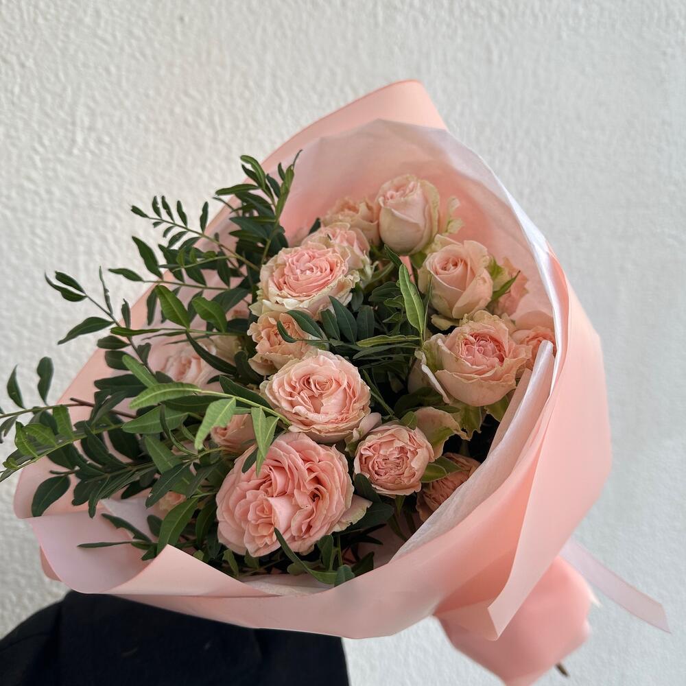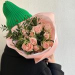 кустовая роза бомбастик 40 см – 5 шт. Писташ – 3 шт. Упаковка дизайнерская – 1 шт.