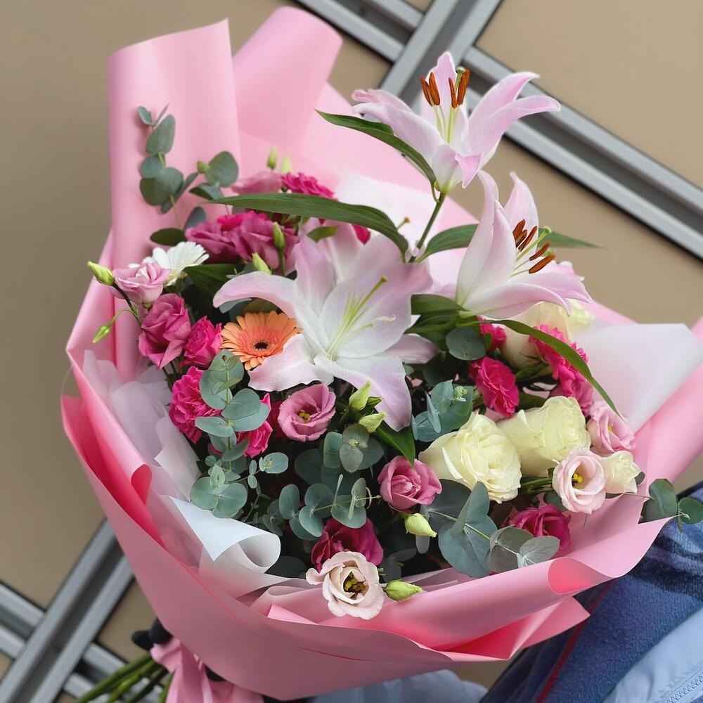 Лилия – 1 шт.Гербера мини – 3 шт.Лизиантус – 3 шт.Эвкалипт – 2 шт.Кустовая роза – 3 шт.Роза – 3 шт.бумага флористическая – 1 шт.Лента – 1 шт.