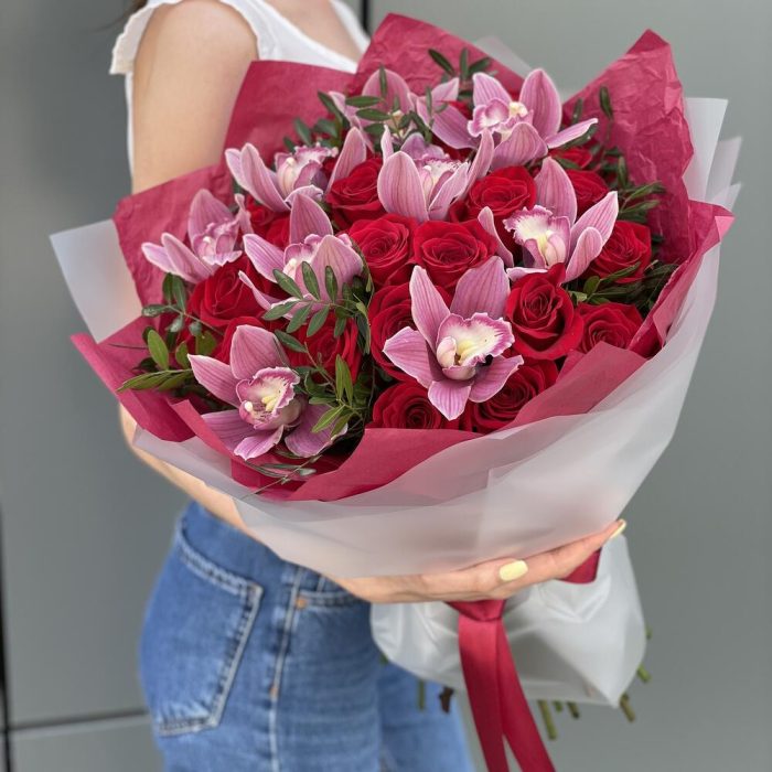 Букет Бурж с красными розами и цимбидиумом