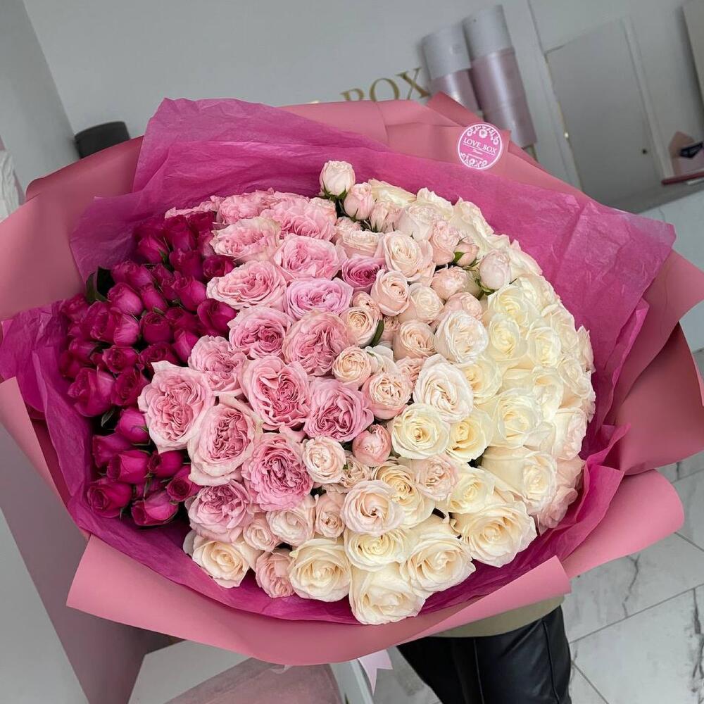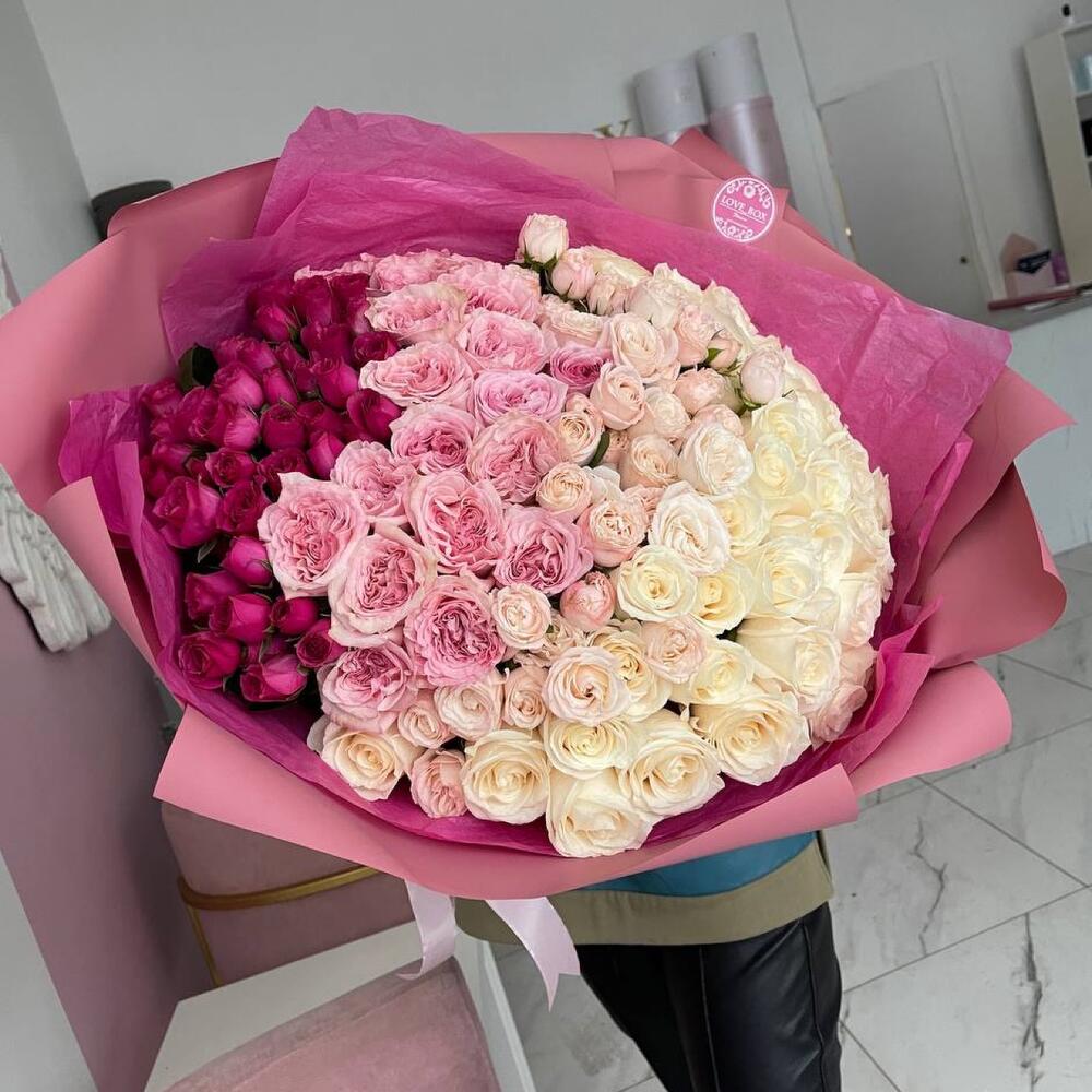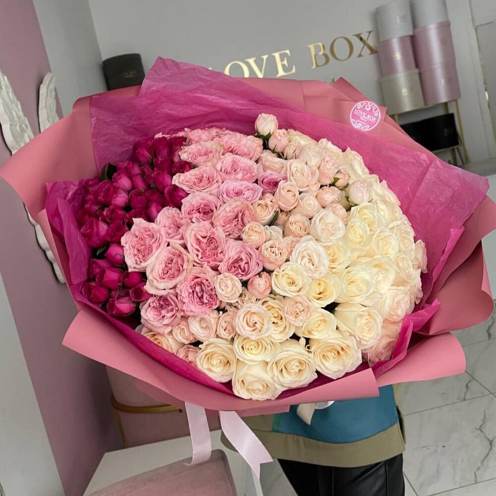 Роза Эквадор – 45 шт.Роза пионовидная – 19 шт.Кустовая роза – 29 шт.Авторская упаковка – 5 шт.