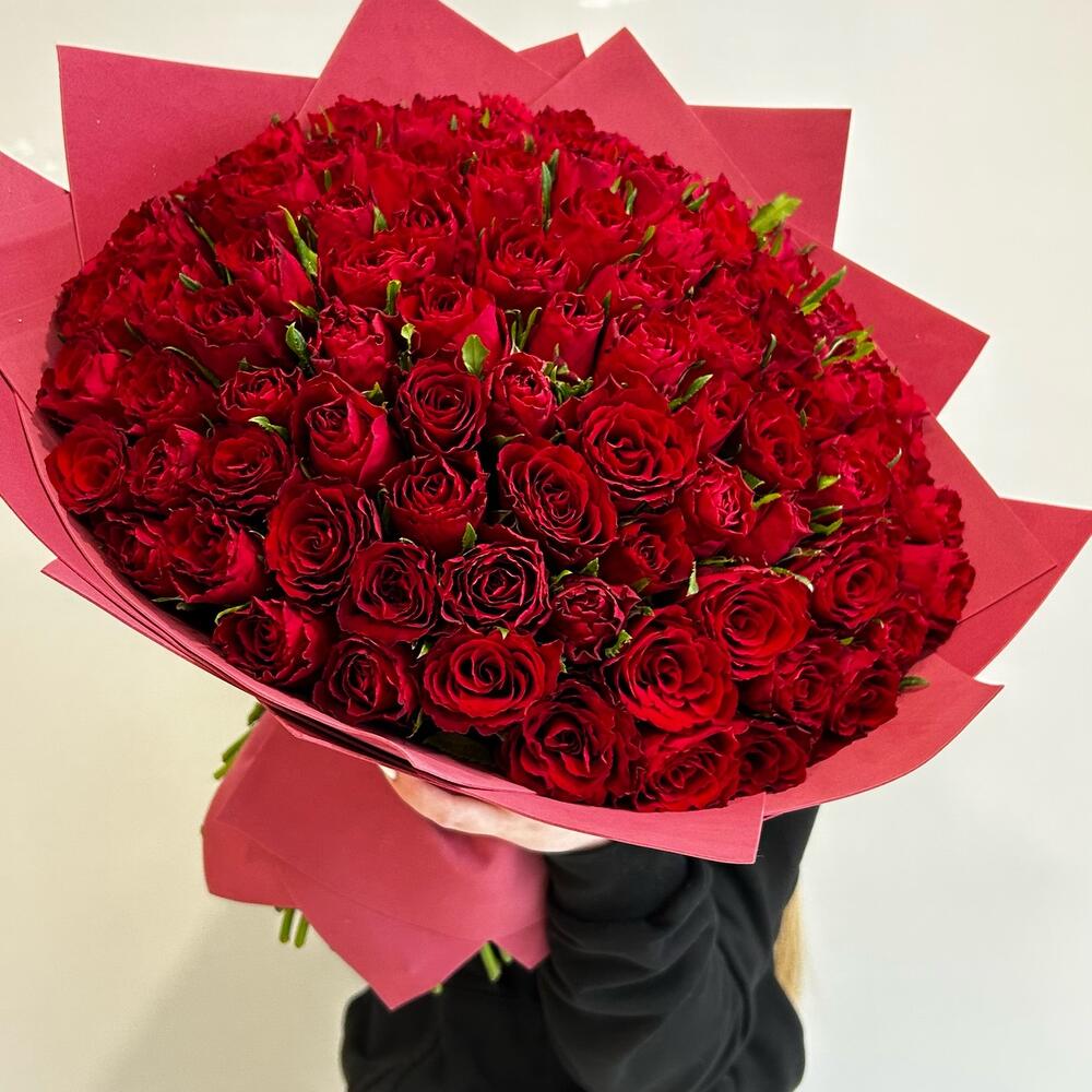 Роза – 101 шт.Лента атласная – 5 шт.Упаковка дизайнерская – 5 шт.