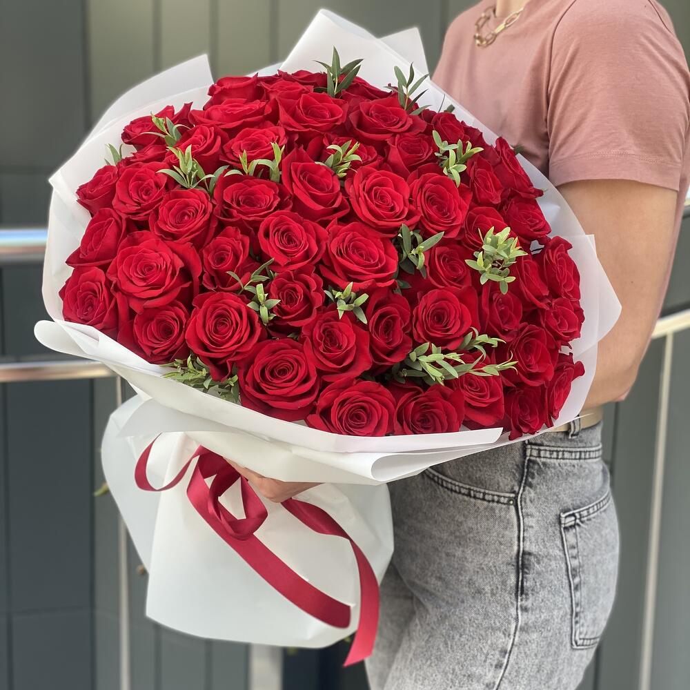 Эвкалипт – 3 шт. Оформление – 1 шт. роза красная фридом – 51 шт.